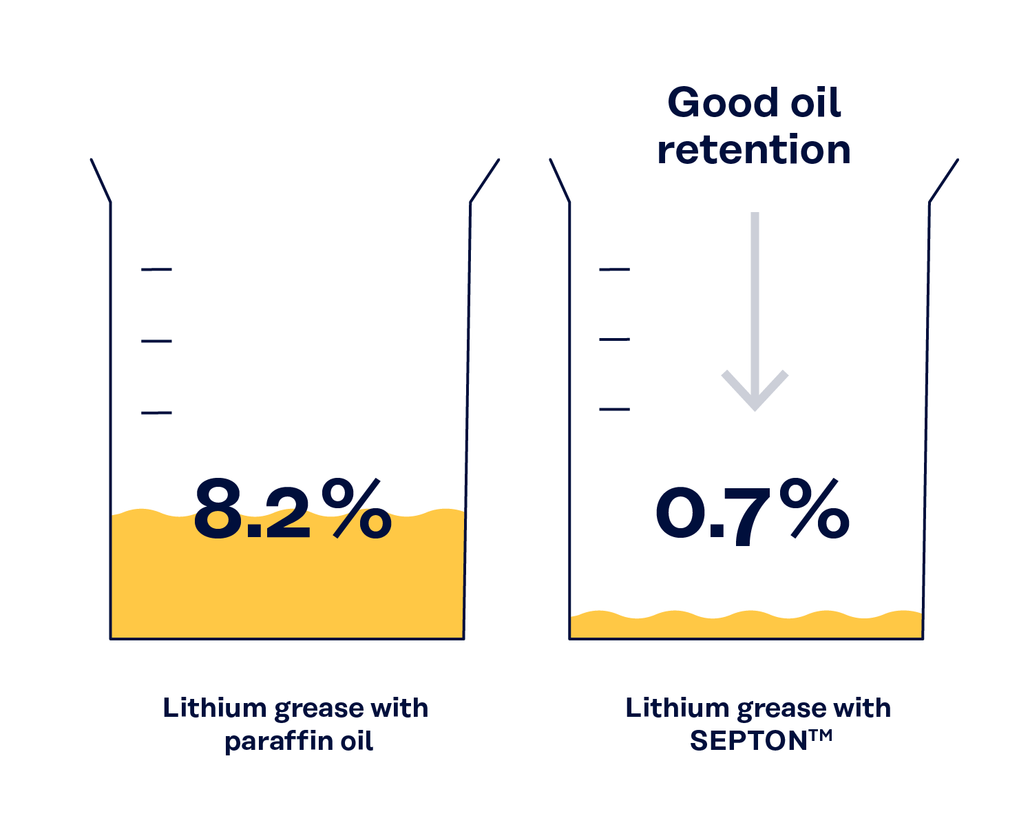 A graxa de lítio é amplamente utilizada devido à sua excelente resistência ao calor e à água, e estabilidade ao cisalhamento. No entanto, ele é normalmente formulado com óleo de parafina, podendo ocasionar a separação do óleo ao longo do tempo, especialmente quando em altas concentrações. É nesse aspecto que o SEPTON™ faz a diferença. Conhecido por sua capacidade excepcional de retenção de óleo, o SEPTON™ pode reduzir significativamente a porcentagem de separação do óleo, de 15% para apenas 0,7%, ajudando a estabilizar as propriedades físicas da graxa ao longo do tempo.