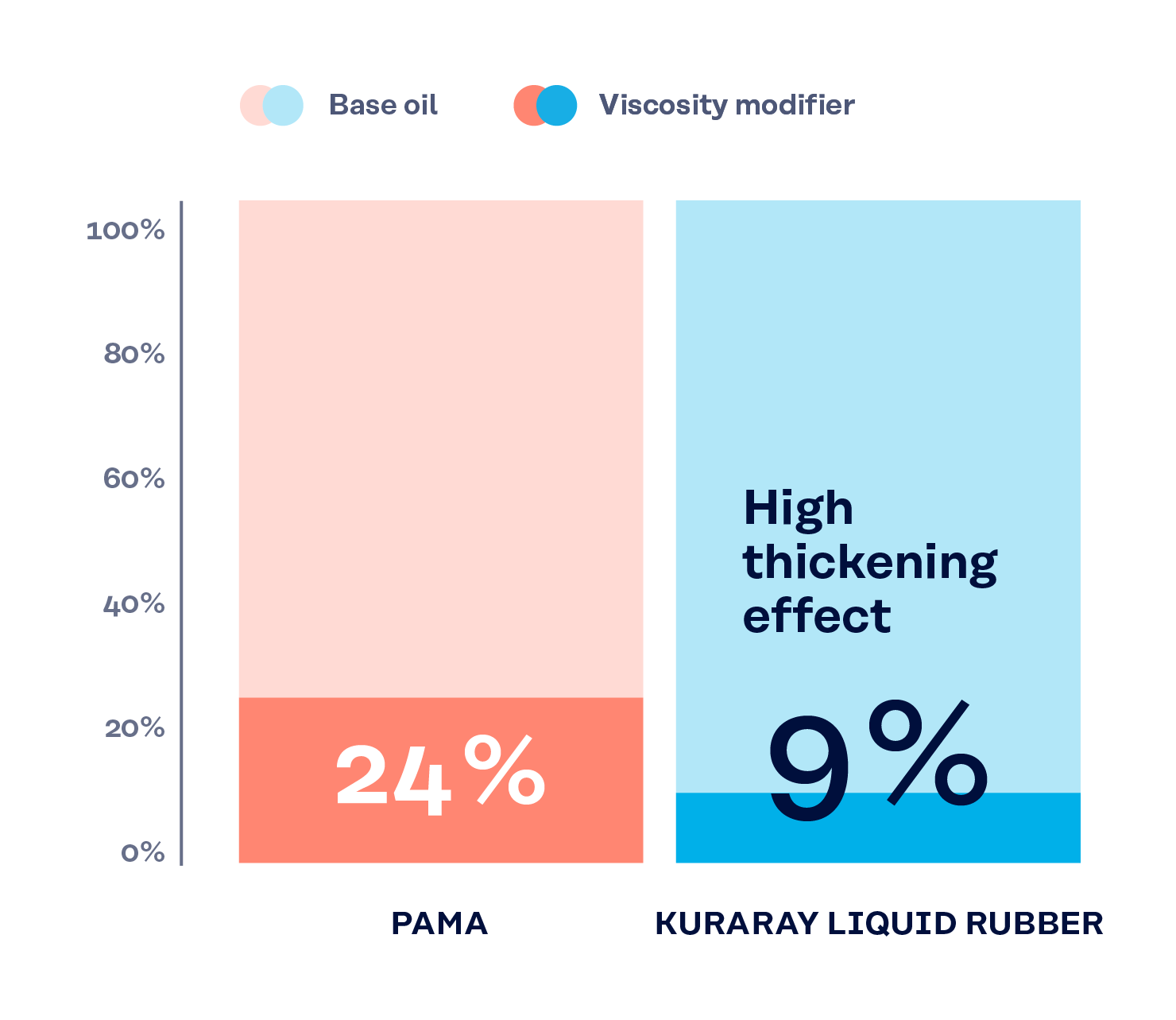 Por exemplo, a KURARAY LIQUID RUBBER pode alcançar a viscosidade desejada numa formulação de óleo de engrenagem 75W-90 com uma quantidade de adição de 9,0% em massa. Um produto concorrente, PAMA, exige uma adição de 23,5% em massa para alcançar a mesma viscosidade.