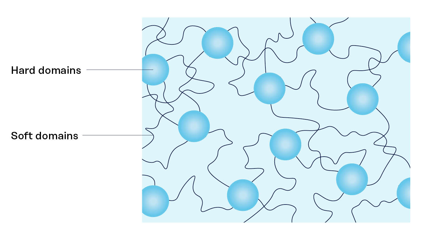 Thermoplastic elastomers are durable, processable, and recyclable plastics with the rubber-like properties of elastomers. They contain both hard domains (which give them their strong, plastic properties) and soft domains (which give them their flexible, elastic properties). Hard domains can consist of polymers with a high glass transition temperature or crystalline polymers, while soft domains typically include amorphous polymers with a low glass transition temperature or polymers plasticized by additives such as a plasticizing oil. TPEs may be produced by blending two separate hard and soft components, or by creating a block copolymer which contains both hard and soft segments within a single polymer chain.